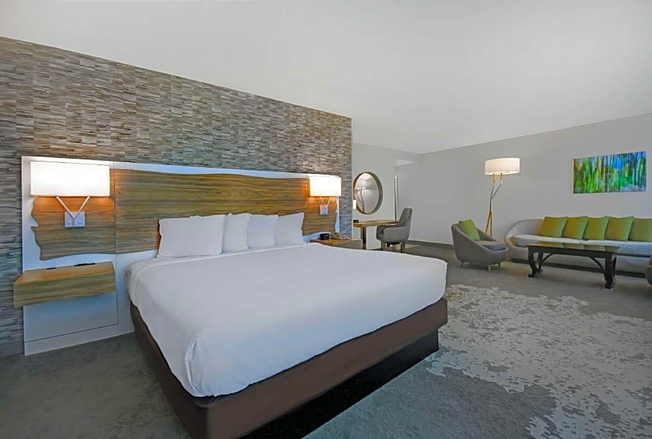This spacious suite includes a roll-in shower for your ease and comfort. This spacious suite features 1 king bed & living area with a full-sized sofa bed. The king bed features the plush Hilton Serenity Collection pillow top mattress with triple sheeting. Relax in this 650 sq. ft. suite with a 42-inch HDTV and deluxe bath amenities. Any corresponding photo may not reflect the specific accessible room type or room feature.